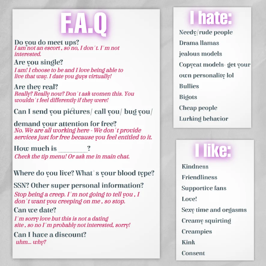 Ballo erotico, Pompino, Topless, Spogliarello, Esibizionismo, Giocattoli per capezzoli, Ripresa della gonna da sotto, Facesitting, Donna sopra, Istruzioni per sborrare, Feticismo dei piedi, Mistress, Zoccolo di cammello, Valutazione del cazzo, Tradimento, Gola profonda, Ditalino, Tacchi, Giocattoli erotici, Twerk, Sega, Cucina, Ahegao, Creampie, Dildo o Vibratore, Gagging, Masturbazione, Spettacolo con olio, Orgasmo, Squirt, Tittyfuck, Cosplay, Doccia, Giochi di ruolo