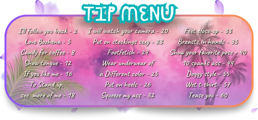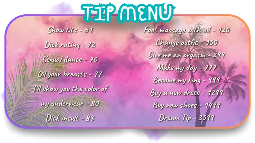 Topless, Tacchi, Bustino, Cosplay, Ballo erotico, Spogliarello, Pecorina, Linguaggio esplicito, Ditalino, Ahegao, Mistress, Esibizionismo, Istruzioni per sborrare, Lattice, Valutazione del cazzo, Umiliazione, Feticismo dei piedi, Nylon, Zoccolo di cammello, Masturbazione, Donna sopra, Spettacolo con olio, Orgasmo, Sculacciate, Ripresa della gonna da sotto, Pompino, Tittyfuck, Facesitting