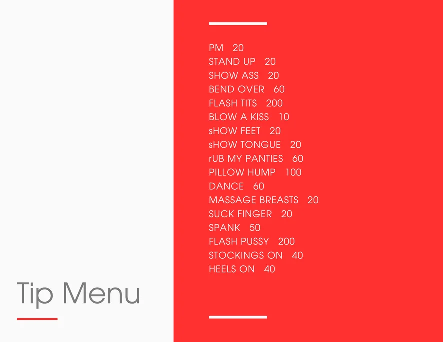 Pecorina, Ballo erotico, Esibizionismo, Sculacciate, Tacchi, Pompino, Donna sopra, Linguaggio esplicito, Sega, Masturbazione, Orgasmo, Spogliarello, Topless, Ditalino, Tittyfuck, Ahegao, Istruzioni per sborrare, Nylon, Giochi di ruolo, Feticismo dei piedi, Valutazione del cazzo, Dildo o Vibratore
