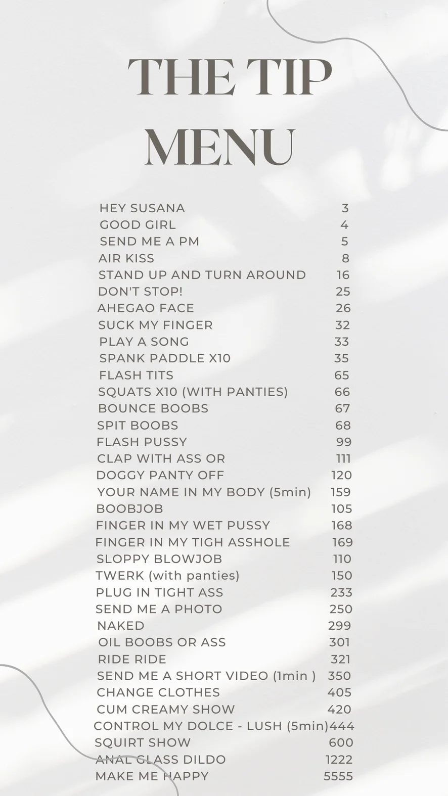 Pecorina, Ahegao, Sculacciate, Ballo erotico, Zoccolo di cammello, Spogliarello, Feticismo dei piedi, Yoga, Twerk, Topless, Linguaggio esplicito, Facesitting, Sborrata in faccia, Giocattoli erotici, Giochi di ruolo, Tacchi, Spettacolo con olio, Pompino, Dildo o Vibratore, Esibizionismo, Ditalino, Gola profonda, Umiliazione, Istruzioni per sborrare, Giocattoli per capezzoli, Masturbazione, Tittyfuck, Hardcore, Donna sopra